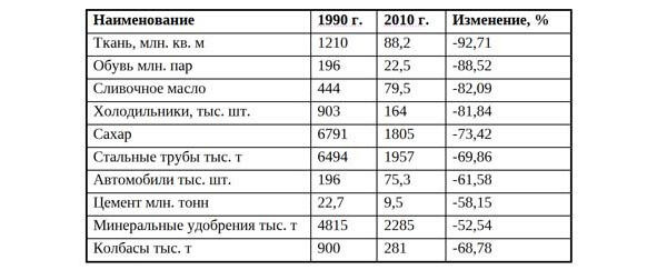 Приведем данные Госкомстата относительно производства в стране тех или иных товаров и услуг в 1990 году и 2010-м. Цифры говорят сами за себя.