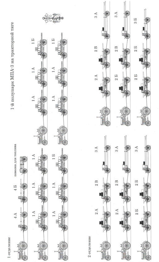 Парк МПА-2 перевозился на 66 повозках (64 мостовых и 2 цистерны) с помощью 22 тракторов Интернационал (тракторный поезд состоял из 3 повозок) или на пароконных повозках, для чего короткое прицепное устройство менялось на дышло.