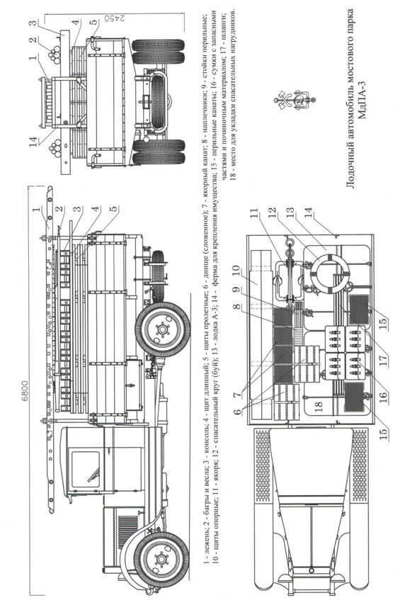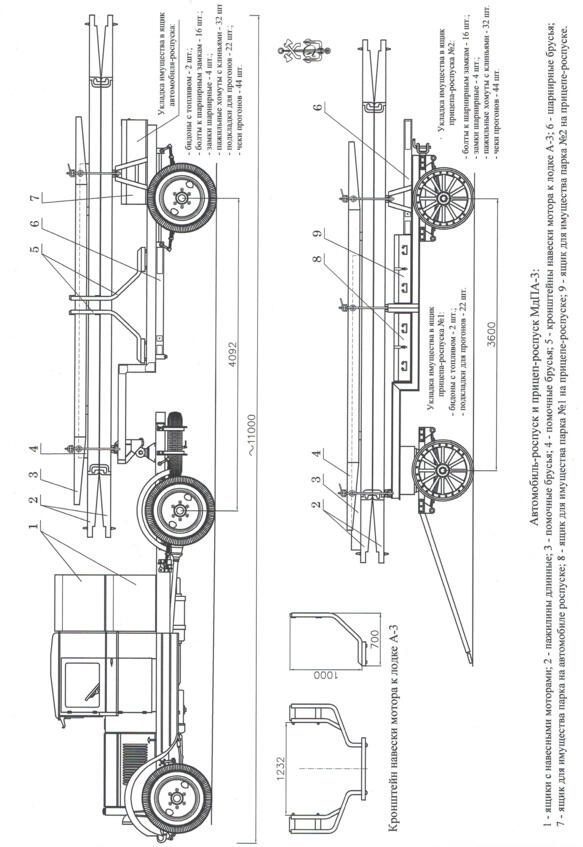 Лодочный автомобиль (прицеп) Литер-Б перевозил тот же перечень, за исключением: якорей 3 шт.; багров 6 шт.; весел 27 шт.; уключин -27 шт.; щитов опорных 7 шт.; штропов длинных 12 шт.