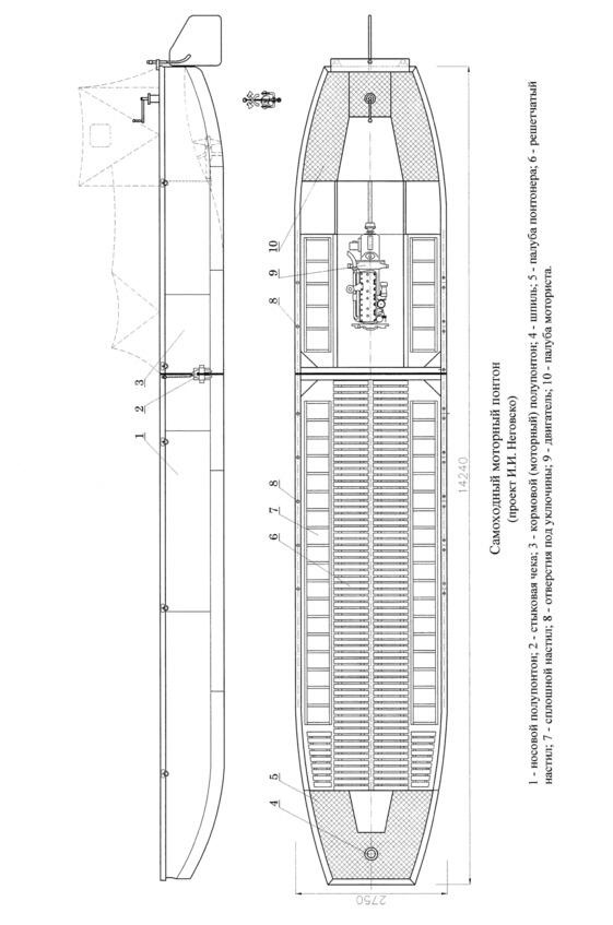 Кормовой (моторный) полупонтон служил для размещения винтомоторной группы, рулевого устройства и топлива. Двигатель устанавливался на фундаменте и крепился к шпациям болтами. Охлаждение двигателя производилось забортной водой. От коробки передач вращение, через промежуточный вал передавалось на гребной вал.