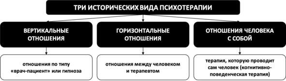Важно заметить, что сами терапевтические отношения в когнитивно-поведенческом подходе носят характер сотрудничества, где терапевт и клиент являются равноправными участниками и партнёрами, что отличает этот подход от вертикальных отношений по типу «врач-пациент». Можно сказать, что когнитивно-поведенческая терапия это, по сути, терапия, которую человек проводит сам с собой при посредничестве терапевта (см. рис. 1).