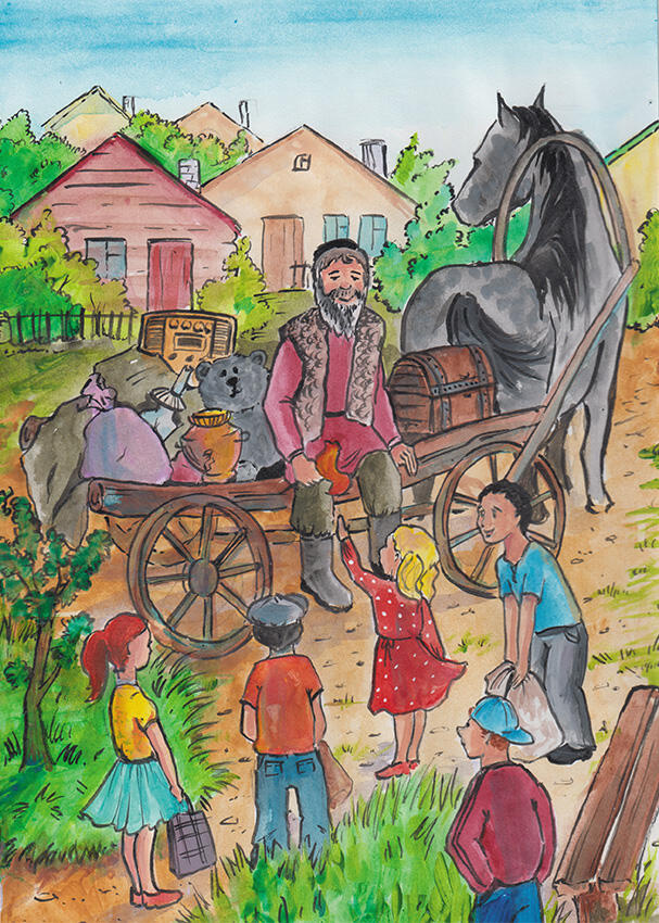 Старьёвщик возил с собой заветный деревянный сундук, обитый железом, на котором висел большой замок. В этом сундуке было много всяких игрушек и других интересных вещей!