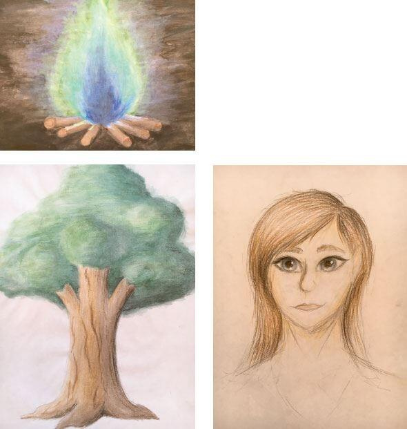Рис. 1.91.11.Мария. Темы заданий: «Ночной костер», «Дерево жизни», «Автопортрет»