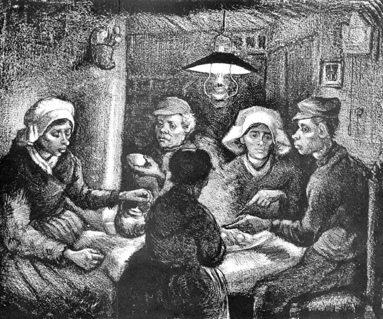 В центре картины картофель, продукт подземного происхождения. Он лежит посередине стола на холсте, цвет которого Винсент называет «цветом очень пыльной картофелины». Группу людей на картине вполне можно назвать семьей.