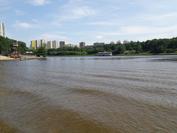 Дети плещутся в огороженной части пляжа, а взрослые нежатся на белом, недавно завезённом, песке. Химкам исполнилось 80 лет, но такой красивый белый песок на пляже впервые! Он кварцевый, мелкий, сыпучий.