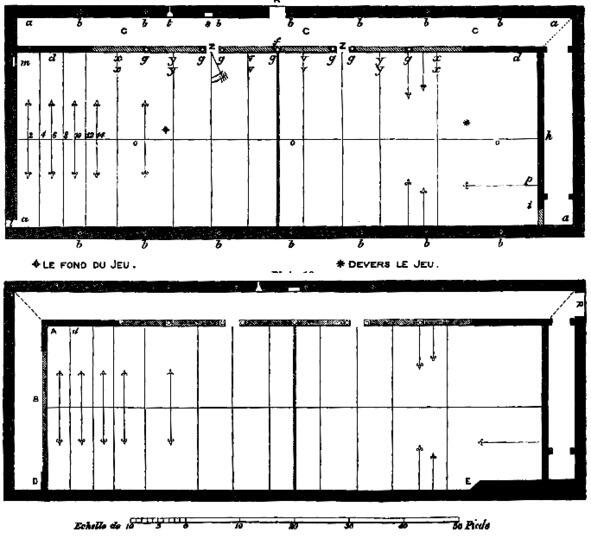 Рисунки 10 и 11 представляют собой уменьшенные копии двух планов, приведенных в книге де Гарсо, исправленные по его собственным измерениям, с описанием корта Le Quarré, который теперь стал делом прошлого, а также того, что с дедансами. Оба плана составлены в масштабе французских футов, и я должен напомнить моим читателям, что французский фут, или pied du Roi, = приблизительно 12°79 английских дюймов. «Каждый теннисный корт говорит де Гарсо в своем пунктуальном и бесценном трактате, представляет собой длинное прямоугольное здание, окруженное четырьмя стенами: две из них- простые и образуют его стороны в длину, а два фронтона в ширину. Площадь, которую они ограждают, составляет 96 футов длиной и 36 футов шириной, так что, с учетом всех внутренних конструкций будут площадь корта должна быть 90 футов в длину и 30 футов в ширину.