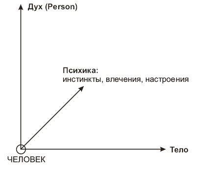 Рис. 1. Трехмерная картина человека по Франклу, описывающая человека как единство трех способов проявления (тело, душа, дух)