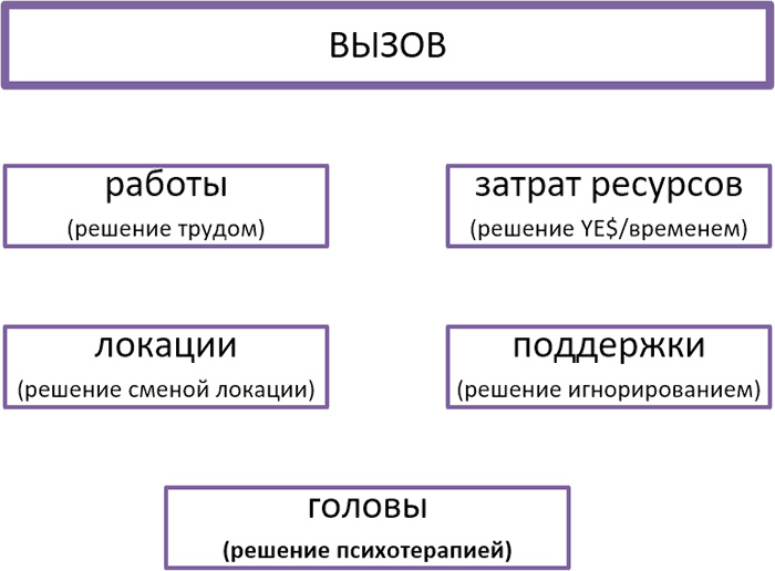 Начнём с вызова. Вызов это всё то, что требует различных типов конкретных усилий. Например вызов работ, сохранить семью и заставить себя не развестись сможете только вы, т. е. это может быть только ваше действие, вы не можете нанять для этого кого-либо со стороны, такой вызов имеет решение только вашим трудом. Или например, у вас сломался автомобиль тут уже есть выбор, самому его починить или нанять кого-либо, в зависимости от вашего решения это будет вызов работ или вызов денежных затрат.