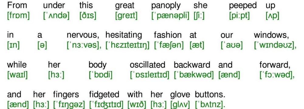 From under this great panoply she peeped up in a nervous, hesitating fashion at our windows, while her body oscillated backward and forward, and her fingers fidgeted with her glove buttons.