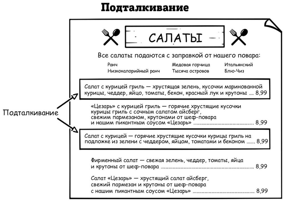 Вас могут подтолкнуть к конкретному действию простым выбором слова или другими фоновыми подсказками. Например, рестораны подталкивают вас к выбору определенного блюда, вынося их на отдельные вкладки, заставляя официантов предлагать блюдо дня или просто обводя в рамку конкретные пункты меню. А магазины и сайты подталкивают к покупке конкретных товаров, помещая их на видное место.