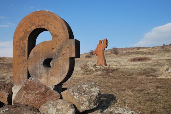 Поблизости, на окраине села Арташаван, находится памятник армянскому алфавиту, установленный в 2005 году в честь 1600-летия возникновения армянской письменности. Все буквы, а их тридцать девять, вырезаны из армянского туфа. Это удивительное место является своеобразным ориентиром для всех, кто следует в сторону горы Арагац к расположенной на ее склоне крепости Амберд. Но добраться туда нам не удалось, дорога оказалась завалена снегом. Эту информацию Вардан предусмотрительно узнал накануне, но, увидев мое удрученное лицо, решил ее все же уточнить, причем весьма оригинальным способом вынудив остановиться автомобиль дорожной полиции.