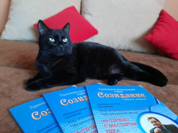 Мой четвероногий любимец улёгся на журналы, только что принесённые мной с почты, и я решила, что это знак! В выпуске литературного журнала «Созидание» опубликован первый эпизод моей истории о девочке-волшебнице. Так вот, я поняла, что непременно должна вписать в сюжет чёрного кота, когда буду работать над следующими главами! Ведь это же классика, согласны? Продолжение ждёт читателя в следующих выпусках