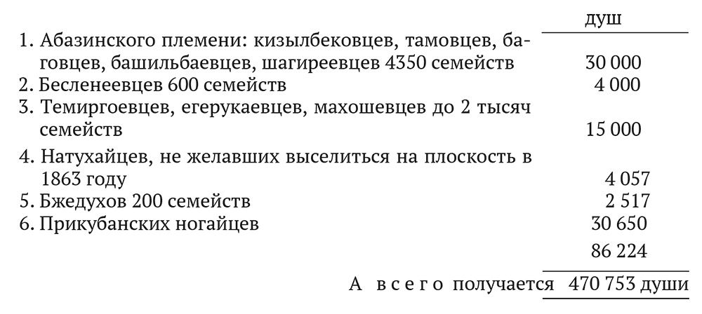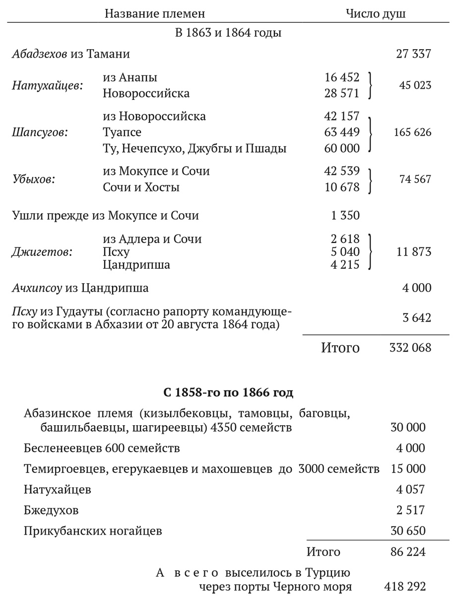 Но все эти цифры необходимо увеличить на 27 671 душу (шапсугов, бжедухов и натухайцев), которые, по окончательному расчету полковника Фадеева, значатся отправленными из Новороссийска и Псезуапе. Всего, стало быть, с восточного берега в 18641865 годах отправлено под наблюдением агентов нашего правительства 384 529 душ. Прибавим к этой цифре выселившихся с 1858-го по 1864 год, по сведениям, доставленным графом Евдокимовым: