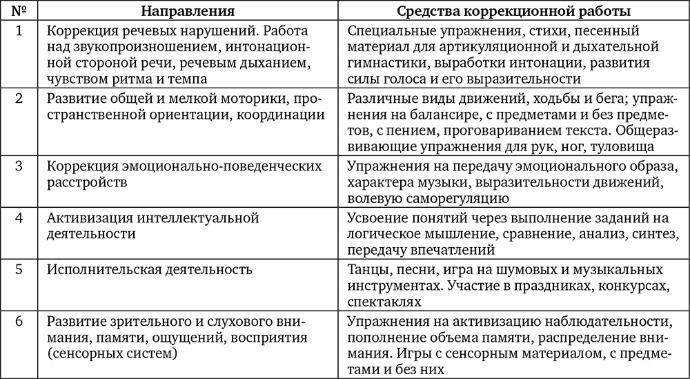 Таблица 1.Основные направления и средства коррекционной работы