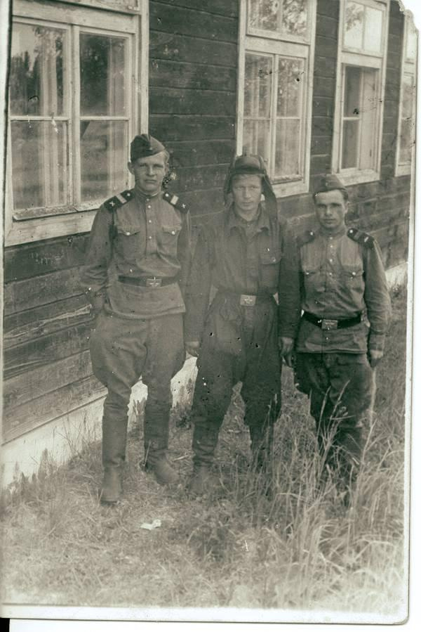 На фото друзья, командиры танков (слева самоходчик). Дед Гоша в центре. Деду не нравилась эта фотография, мол, я здесь страшно вымотанный, сразу после марш-броска. Одни глаза остались. А мне нравится.