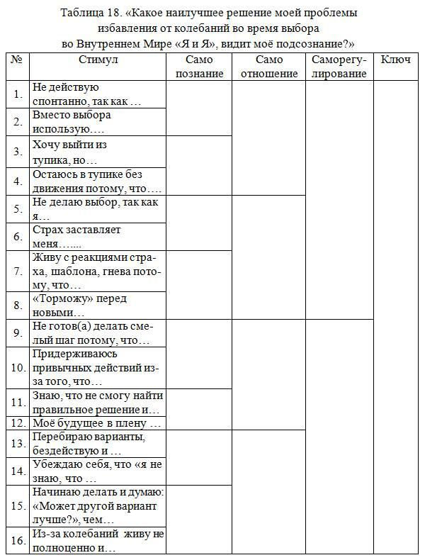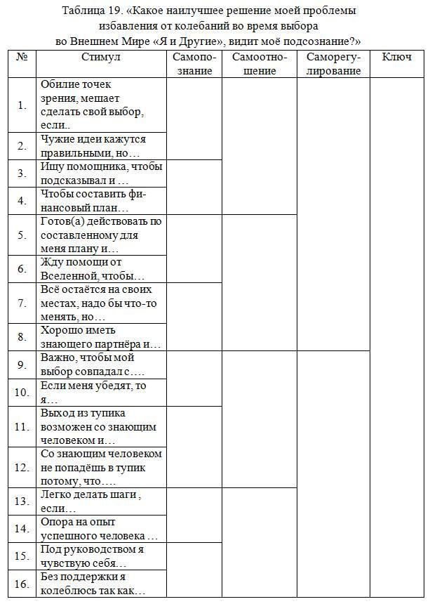 После того, как Вы поработали с ключами с помощью колоды метафорических ассоциативных карт «Поиск и реализация ресурсов саморазвития» (смотрите Приложение 3), и нашли ответ на свой вопрос: «Какое наилучшее решение моей проблемы избавления от колебаний во время выбора, видит моё подсознание?». Можно приступить к раскрашиванию мандалы «Избавление от колебаний во время выбора», смотрите Приложение 1. Рисунок 2.