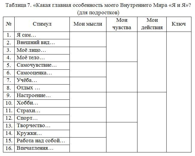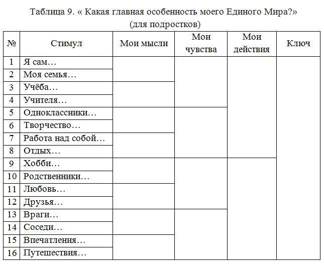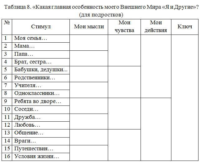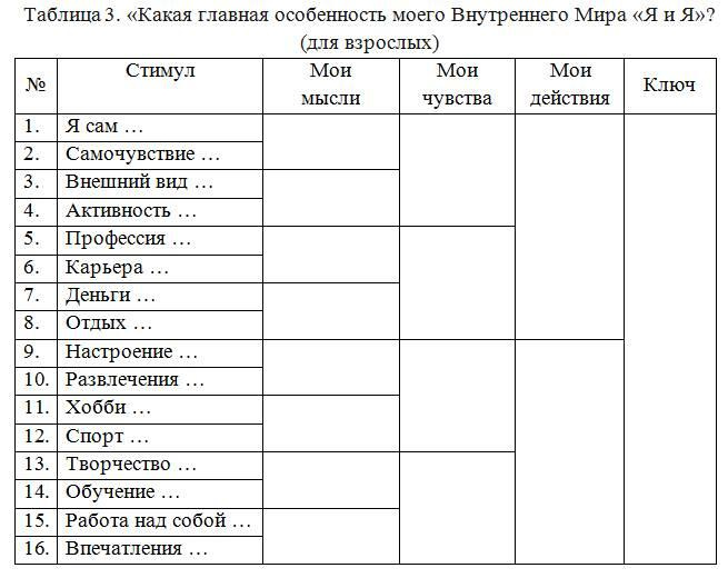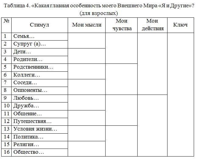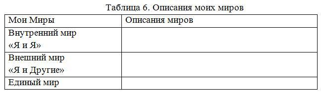Итак, по заданному образцу можно приступить к выполнению Вашего упражнения. Сначала следует изучить Внутренний Мир «Я и Я», затем Внешний мир «Я и Другие», и, наконец, Единый мир. Сравнение результатов даст возможность глубже осмыслить себя. В упражнении представлены два варианта: для взрослых и для подростков (обучающихся).