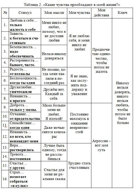 Примечание. В колонке «Стимул» слова, написанные обычным шрифтом это задания методики, а выделенные Жирным шрифтом -написанные клиентом. Все остальные колонки заполнены клиентом («Мои мысли», «Мои чувства», «Мои действия» и «Ключ»).