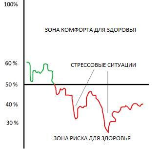 Из исследований в области медицины известно, что иммунная система не может работать без энергии достаточной мощности. Для лучшего понимания данного факта разберём график энергобаланса человека. Всё, что показано на графике выше 50% это зона комфорта и хороший уровень энергобаланса для здоровья человека. То, что показано ниже 50%, является зоной риска для здоровья, которая приводит только к дисбалансу и к различным формам заболеваний.