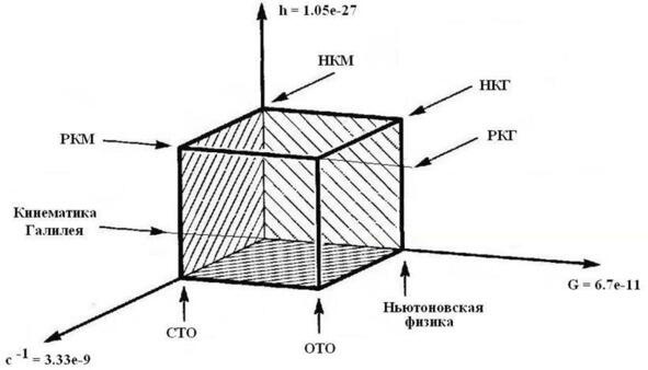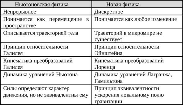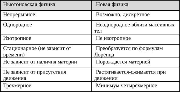 Дальнейшим развитием СТО стала общая теория относительности Эйнштейна, математический аппарат которой разработан математиком Грассманом и основывается на тензорном анализе в обобщённых криволинейных геометриях Римана. ОТО дала дальнейшее развитие закона всемирного тяготения Ньютона и позволила объяснить законы эволюции Вселенной, построить теорию «чёрных дыр». В рамках этой теории гравитационное поле локально эквивалентно ускорению, источники поля не являются первичными объектами, их локализация определяется коэффициентами кривизны физического пространства. Знаменитый эксперимент с падающими лифтами демонстрирует, что в системе свободно падающего лифта гравитация исчезает, но она не исчезает во всём пространстве сразу. Далее мы приводим сравнительные характеристики пространства, времени и движения в классической физике Ньютона и новой физике ХХ века.
