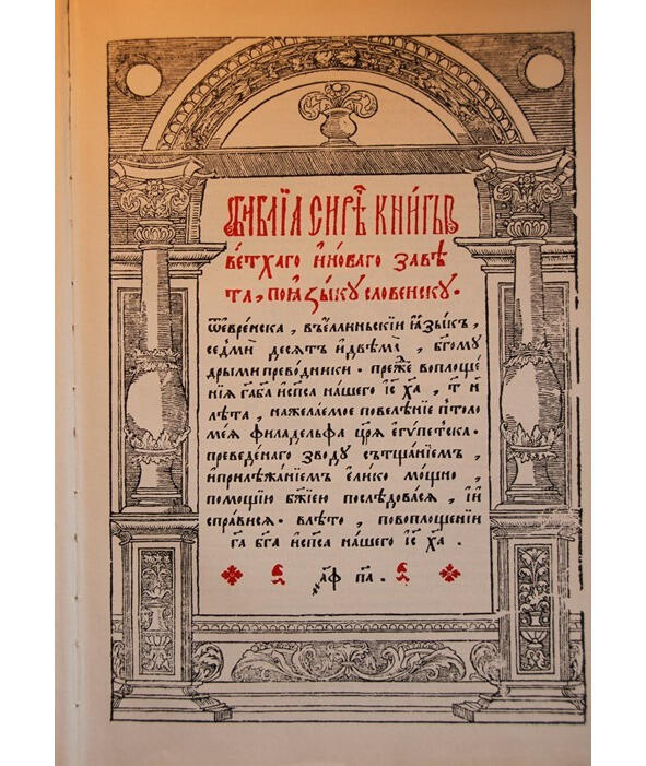 Из Еврейского в Еллинский язык, семьюдесятью двумя Богомудрыми переводчиками. Прежде воплощения Господа Бога и Спаса нашего Иисуса Христа, 350 лета, на желаемое повеление Птолемея Филадельфа царя Египетского. Переведенного извода со старанием и прилежанием сколько можно, помощью Божиею исследовалась и исправилась. В лето после воплощения Господа Бога и Спаса нашего Иисуса Христа. 1581.