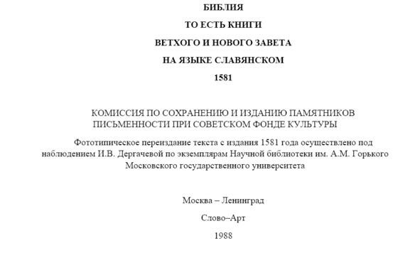 В год празднования 1000летия крещения Руси (1988) московский кооператив «СловоАрт» при содействии председателя Советского фонда культуры академика Д. С. Лихачёва задумал осуществить переиздание Острожской Библии. Эта поддержка и непосредственная помощь ряда русских церквей позволили, несмотря на все трудности, успешно завершить это издание, третье по счёту из предпринимавшихся в нашем столетии.