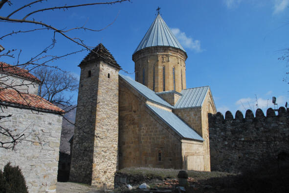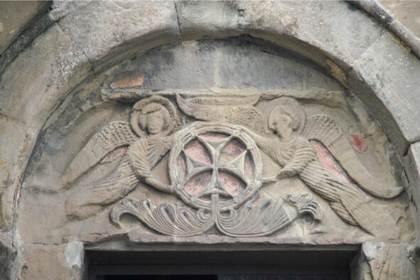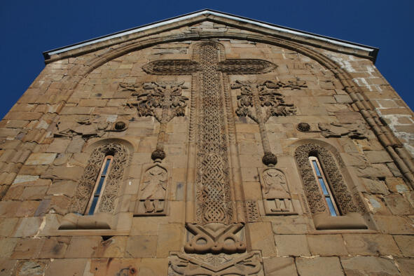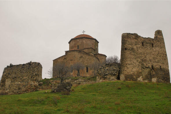 Представьте себе ситуацию. Вы едете с гидом в машине, ведя неспешную беседу и одновременно рассматривая проносящиеся за окном объекты, пока где-то там, в стороне, не показывается нечто особенное, из-за чего ваши глаза начинают светиться от счастья. Гид как бы мимоходом поясняет увиденное вами, заявляя, что это совершенно отдельная поездка, в программу не входит, можно съездить туда в другой день. И так далее и тому подобное. Вы киваете, соглашаясь с собеседником, но, тем не менее, продолжаете по-прежнему неотрывно и восторженно смотреть в сторону понравившегося объекта. Как вдруг понимаете, что он приближается. И вот, через мгновение, вы возле него. Именно так и произошло с нами в начале пути, когда проезжали монастырь-храм Джвари (Jvari), где, по легенде, Святая Нина воздвигла крест, сделанный из виноградных лоз, скрепленных ее волосами.
