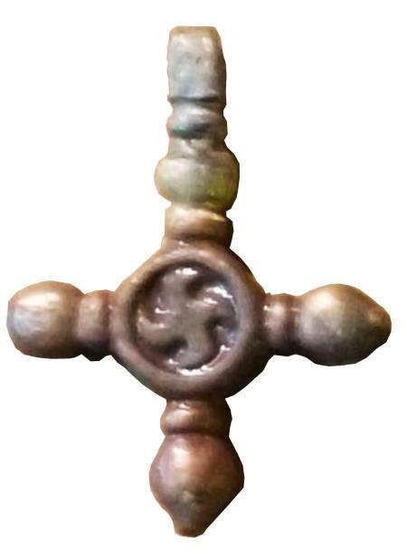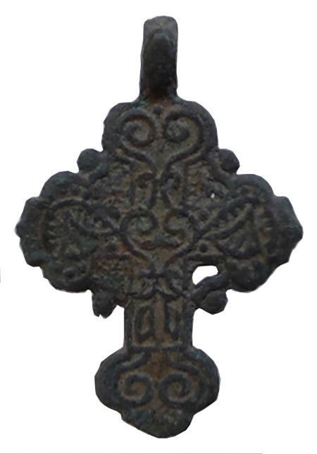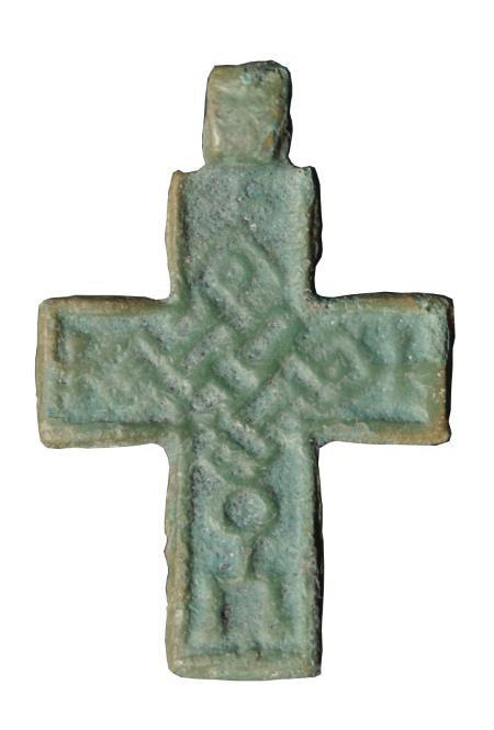 Например, на данном кресте в центре находится солярный свастический знак. На других крестах мы также в изобилии встречаем древние языческие символы. Подчеркнем, что речь идет не о каких-то особенных крестах, а о самых распространенных, нательных, т. е. тех, которые носили на шее практически все (Рис. 34Рис. 36).