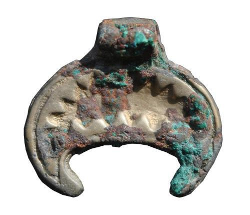 Узор на «лунницах» тоже часто имеется. Это могут быть языческие символы, но могут изображаться и более прозаические вещи. Например, на рис. 37 представлен «зубастый» узор, который, по-видимому, аллегорически напоминает о насечке, которая часто делалась на «рабочем крае» кресала, чтобы оно лучше высекало искры. Впрочем, узор может обозначать и огонь, искру, которая возникает при соударении кремня и кресала (Рис. 37).
