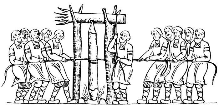 Однако высекание искр при помощи кресала было не единственным способом добывания огня у славян. Такой универсальный способ, как трение деревянной палки о другую, тоже был распространен, но только в несколько специфическом виде. Дело в том, что подобный способ добывания огня был коллективным. Собиралась специальная «установка» (Рис. 38), где на центральный столб навивалась веревка, за концы которой потом люди попеременно тянули. Столб вращался в разные стороны, и из-за трения об основу, в которую он упирался, возникал огонь.