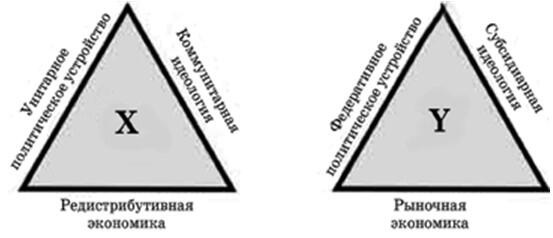 С.Г. Кирдиной-Чэндлер выделяет два идеальных типа качественно различных институциональных матриц, агрегирующих в себе реальное многообразие социальных связей общества Х и Y-матрицы. Они отличаются комплексами образующих их базовых институтов (рисунок 8).