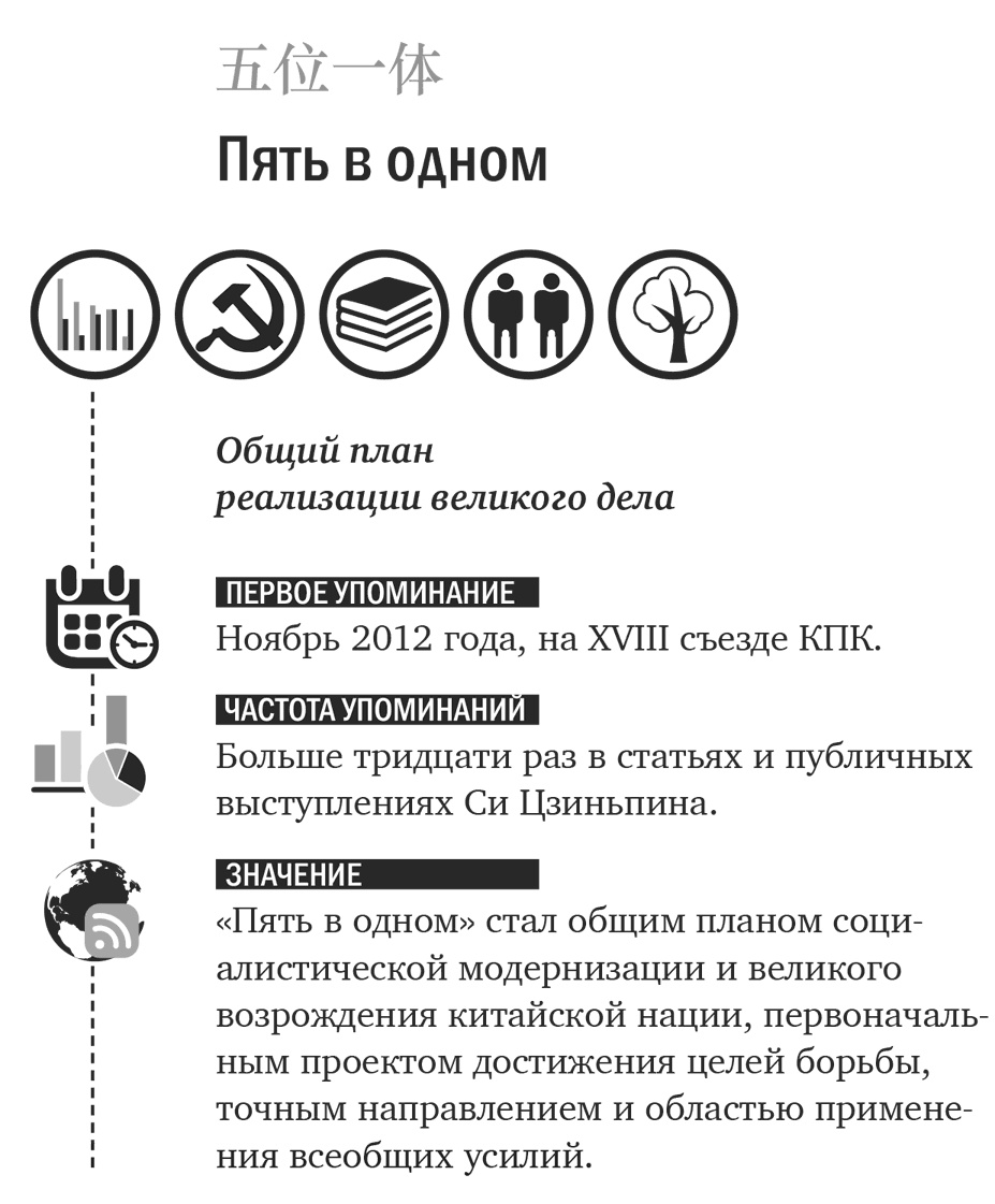 «Пять в одном» это обобщенная формулировка планов социалистической модернизации, касающихся экономического, политического, культурного, социального и экоцивилизационного строительства.