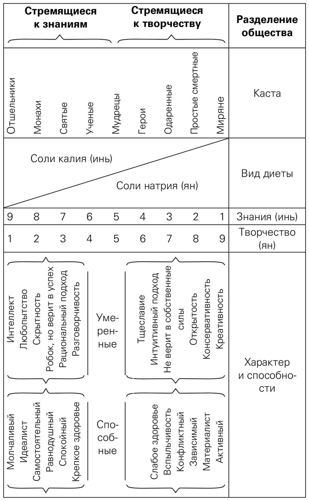 Есть и недуги, характерные для отрицательной конституции: психические заболевания, различные неврозы, тахикардия, анемия, диарея, птоз желудочно-кишечного тракта, гипотензия, нейропатическая боль[13], мигрень, болезнь Меньера, холодные конечности, аллергия и т. д. К сожалению, большинство из перечисленного относится к хроническим болезням. Люди этого типа тяжело переносят недомогание, даже если это обычная простуда или загноившаяся ранка. Тем не менее принято считать, что человек, страдающий от хронического заболевания, лучше заботится о своем здоровье, поэтому и живет дольше. Как говорят японцы, «ветки вербы не сломаются под весом снега». В своем труде «Гигиена питания» («Табэмоно ё:дзё:хо:») доктор Исидзука представил таблицу «Разделение по интеллектуальным и творческим устремлениям» (см. таблицу 3).