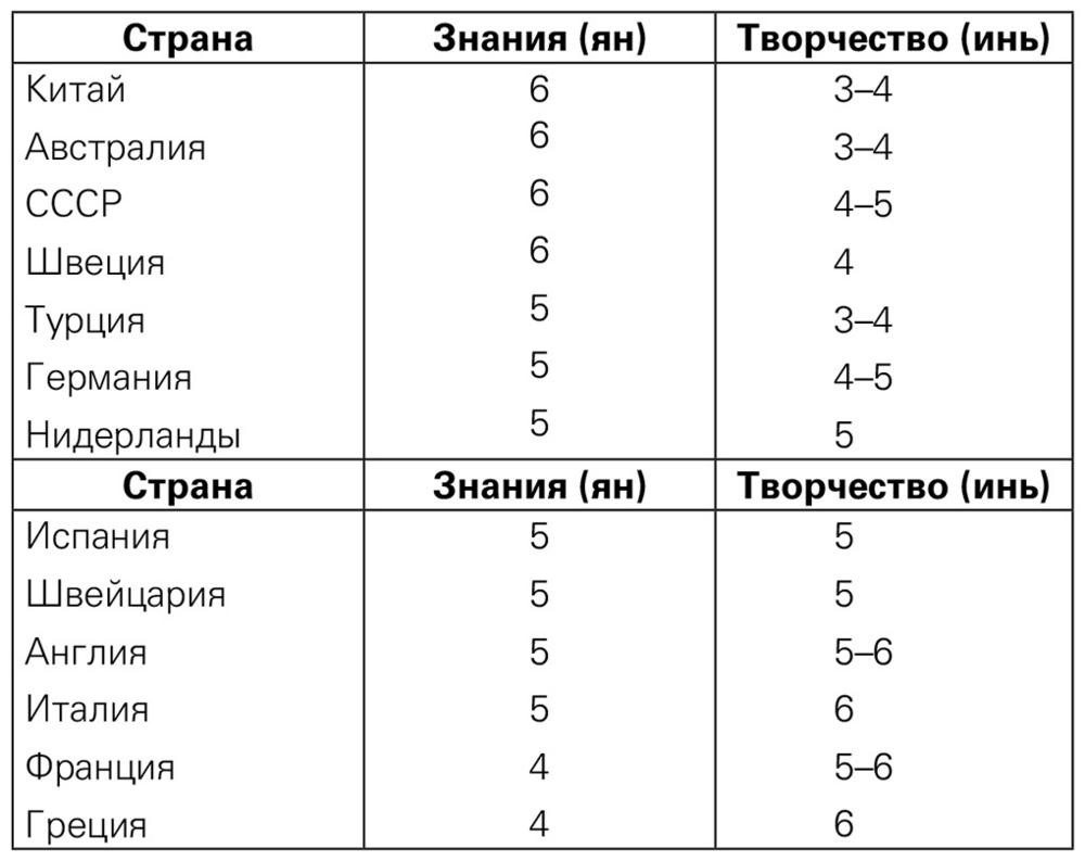 В таблице 4 вы можете увидеть степень интеллектуальных (ян) и творческих (инь) устремлений в зависимости от национальности. Доктор Исидзука был фармацевтом, что соответствовало званию генерала, он участвовал в войнах, поэтому эта таблица содержит в себе оценку жителей разных стран в эпоху Мэйдзи.