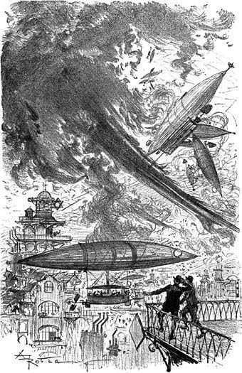 Беда была так сказать уже на носу, когда ее наконец усмотрели. Тогда вся масса воздушных экипажей ринулась в самом фантастическом беспорядке вниз, чтоб как нибудь укрыться от настигавшего ее урагана. Более чем тысячная толпа разнообразнейших летательных снарядов перепуталась в хаотическую груду, причем дело не обошлось без столкновений, сопровождавшихся во многих случаях серьезными авариями. Торнадо, налетевшее с быстротою молнии, унесло с неудержимою силой все, что не успело своевременно спастись бегством. Злополучные воздушные корабли, захваченные ураганом, были несколько секунд спустя брошены в изуродованном виде наземь в двухстах верстах от Тура. Счастье еще, что большие воздушные суда, на которых находились члены воздухоплавательного клуба со своими семьями, были снабжены новоизобретенным прибором, соединявшим электрометр и резервуар изолирующего газа с автоматически действующим клапаном. Как только отклонение стрелки электрометра перешло за известный предел и указало существование в атмосфере опасного напряжения, клапан открылся сам собою, и воздушные суда, окружённые надежным изолирующим облаком, были в состоянии благополучно достигнуть пристани клуба, выдержав, впрочем, на пути сильнейшую качку.
