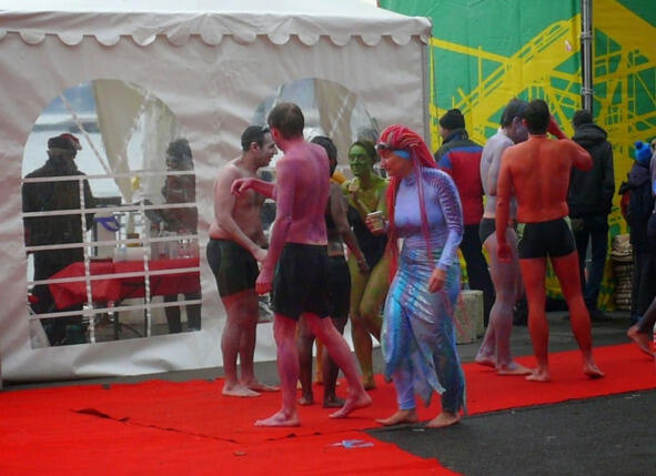 В чём же соревнуются пловцы-моржи? Им надо проплыть дистанцию в 125 водных метров в районе Английского сада. Пловцы-профи плывут на время. Рекорд = чуть больше одной минуты, но большинство участников растягивают удовольствие = для них это костюмированный бал-маскарад. И шампань распивают в водах Лемана, и фондю едят (плавно «колыхаясь» на волнах озера), и гладиаторские бои проводят, и заключённые пиратыиз тюрем сбегают вплавь = фантазия участников безгранична и весела, что особенно привлекает зрителей в это купальное воскресенье на набережную Женевы в районе Английского сада.
