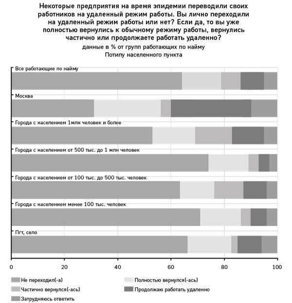 К началу июля 15 % наемных работников вернулись на привычные рабочие места полностью, 7 % частично (на бюджетных предприятиях немногим больше, чем на частных: 9 и 6 % соответственно). Все еще продолжают трудиться из дома 9 % наемных работников. Среди москвичей и лиц с высшим образованием этот показатель самый высокий: 30 и 15 % работающих по найму соответственно.