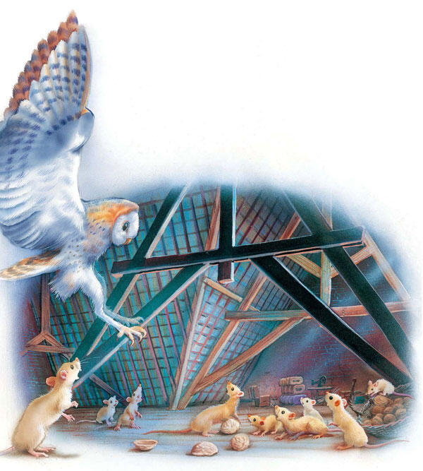 Папа рассказывал мне, что совы иногда залетают на чердак и охотятся на мышей. Но не всегда это удачная охота. Вот и на этот раз сова не успела спикировать на мышей. Они в панике разбежались и юркнули в норки.