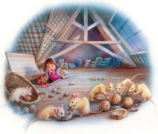 Там мыши, много маленьких мышек! Они опрокинули корзинку с грецкими орехами и играют в мышиный футбол.
