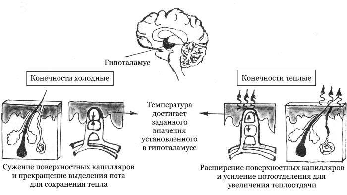 Похолодание конечностей обычно говорит о продолжающемся подъеме температуры тела. Для уменьшения теплоотдачи и сохранения тепла уменьшается кровоток в поверхностных сосудах конечностей. Часто это сопровождается ощущением озноба. После того как температура поднимется до заданного уровня или подействует жаропонижающее средство, конечности обычно перестают быть холодными.