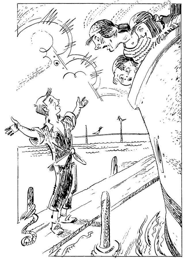 Артем испугался: надо спешить, а то отчалят без него. Он шагнул на палубу, пригибаясь, чтобы его не заметили. Но зацепился ногой о свернутый канат и с грохотом упал.
