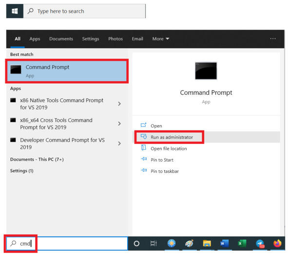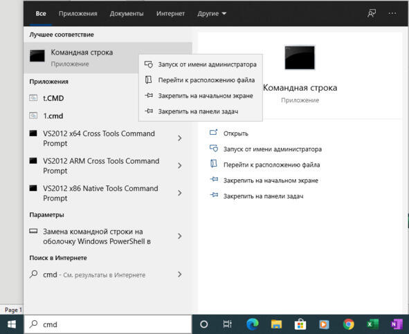 Второй способ запустить командное окно воспользоваться поиском. В левом нижнем углу экрана находим окно поиска [Type here to search] и вводим название команды cmd, см. рис.