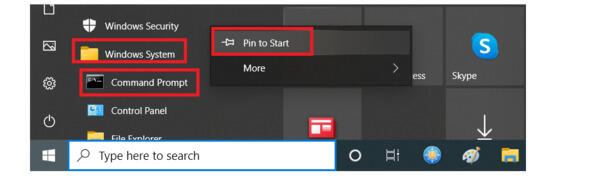 Открываем меню программ и находим наше командное окно. Поводим к нему курсор, нажимаем правую кнопку мыши и выбираем в контекстном меню Pin to Start, см. рис.