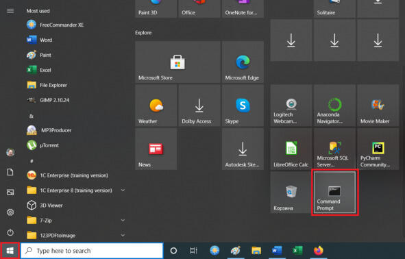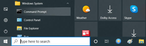 Нажимаем кнопку Пуск, затем прокручиваем меню программ до раздела Windows System и находим программу Command Prompt, см. рис.