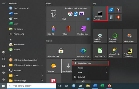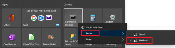 К сожалению, наша иконка оказалась в самом низу списка. Можно заняться украшательством и перетащить нашу иконку наверх. Потом удалим ссылки, которые нам не так часто нужны выбираем в контекстном меню Unpin from Start, см. рис.