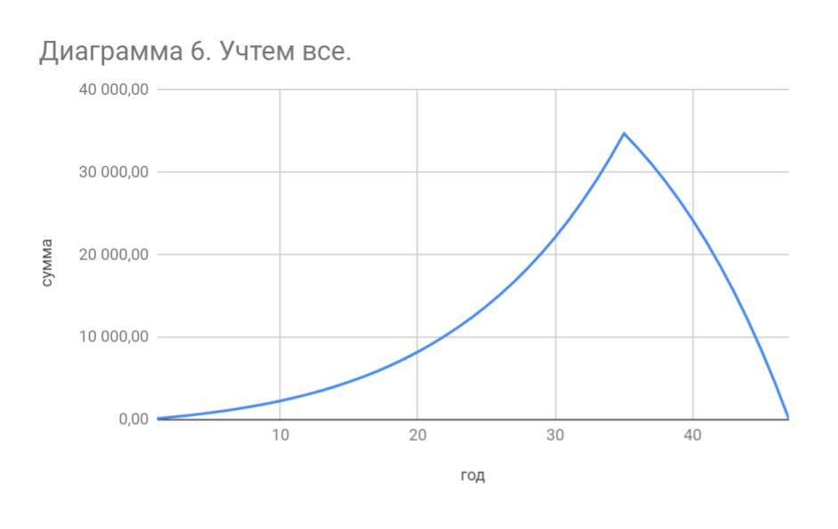 Материальное благополучие будет достигнуто в 56 лет (26 лет на графике). Человек еще достаточно молод и полон сил, а его расходы уже оплачены до конца жизни.