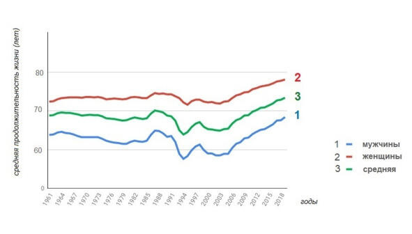 Она наметилась в 1986: на графике виден подъём кривой (учёные объясняют это действием «сухого закона», но есть и причина психологическая: это было начало перестройки, время больших надежд). Затем наступил 1991 кривая резко поползла вниз. И только в 2005 начался её плавный подъём и мы включились, пусть и с опозданием, в общемировой процесс. Тенденция продолжается: с каждым годом средняя продолжительность жизни в России увеличивается.