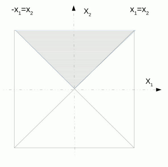 Рис. 2.4. Рассечение гиперкуба. Случай двумерного пространства. Обратите внимание на уравнения x2 = x1 или привычнее y = x это линяя под углом 45 градусов или биссектриса угла. Подумайте, как будут расположены точки на прямой, описываемой уравнением x2 =-x1