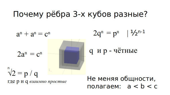 Не меняя общности, можно считать что справедливо неравенство для нашей тройки чисел a <b, где b, в свою очередь, меньше числа с, стоящего в правой части уравнения теоремы Ферма.