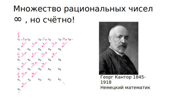 Вместе с тем, действительные числа сосчитать невозможно это множество образует континуум. Между двумя близкими рациональными числами всегда найдётся сколько угодно много других иррациональных чисел. Например, в треугольнике средняя линяя равномощна основанию. Это следует понимать так, что каждой точке на средней линии треугольника соответствует точка на его основании, и наоборот.